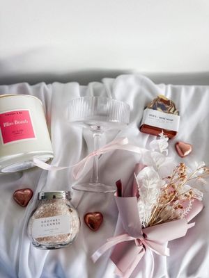 A thoughtful collection of Mum's favourite things - bath soak, handmade soap, candle, everlasting mini bouquet, coupe glass and sweet mini chocolate hearts, beautifully presented in a gift box and finished with a matching ribbon.